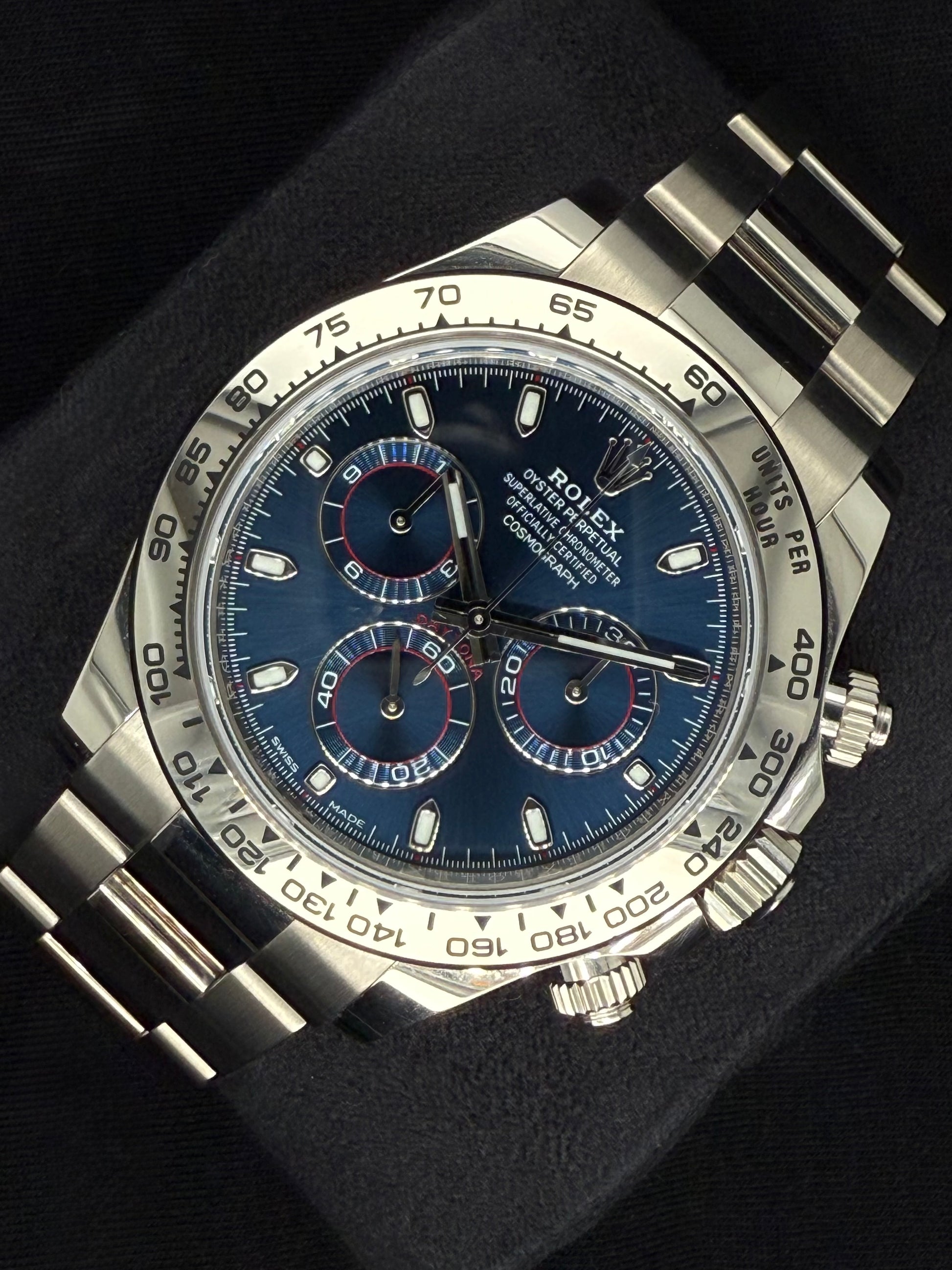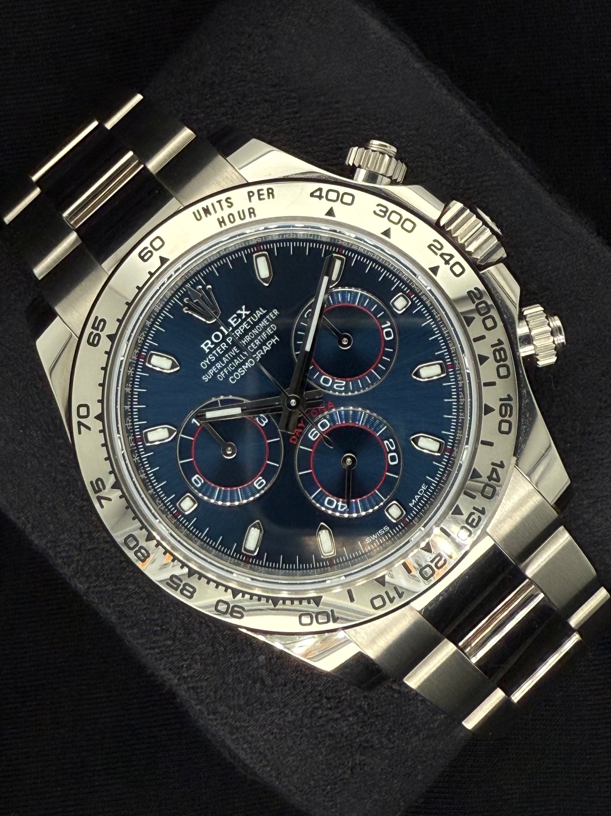The Rolex Daytona is the ultimate chronograph, designed for those who demand precision and style. With its 40mm case, available in Oystersteel, 18ct yellow gold, 18ct white gold, 18ct everose gold or platinum, the Daytona combines luxury with performance.