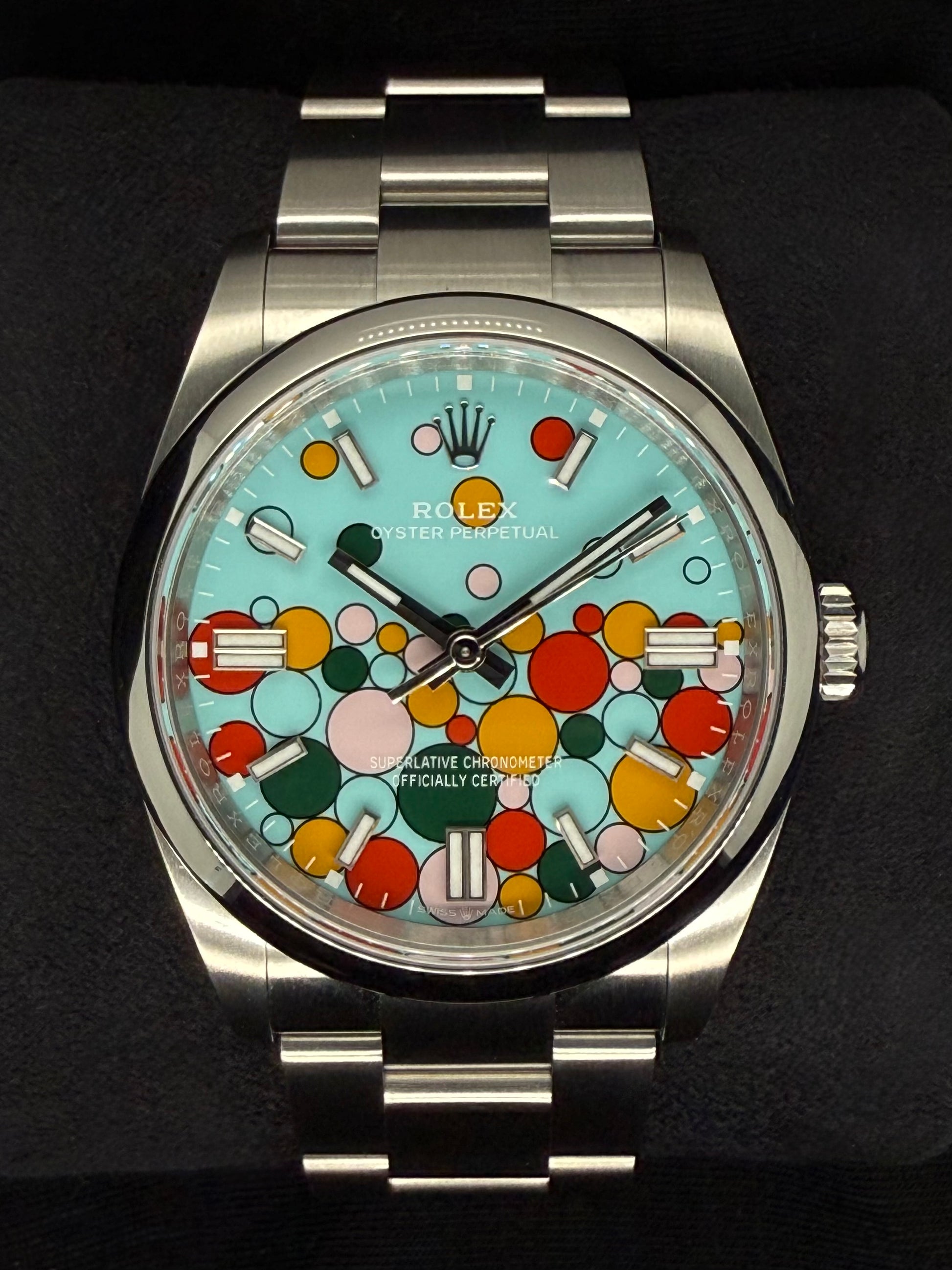 The dial of the Oyster Perpetual is available in a range of vibrant colours, including striking blue and the colourful 'Celebration' dial. Each dial is finished with the iconic hour markers and the Cyclops lens over the date for easy readability.