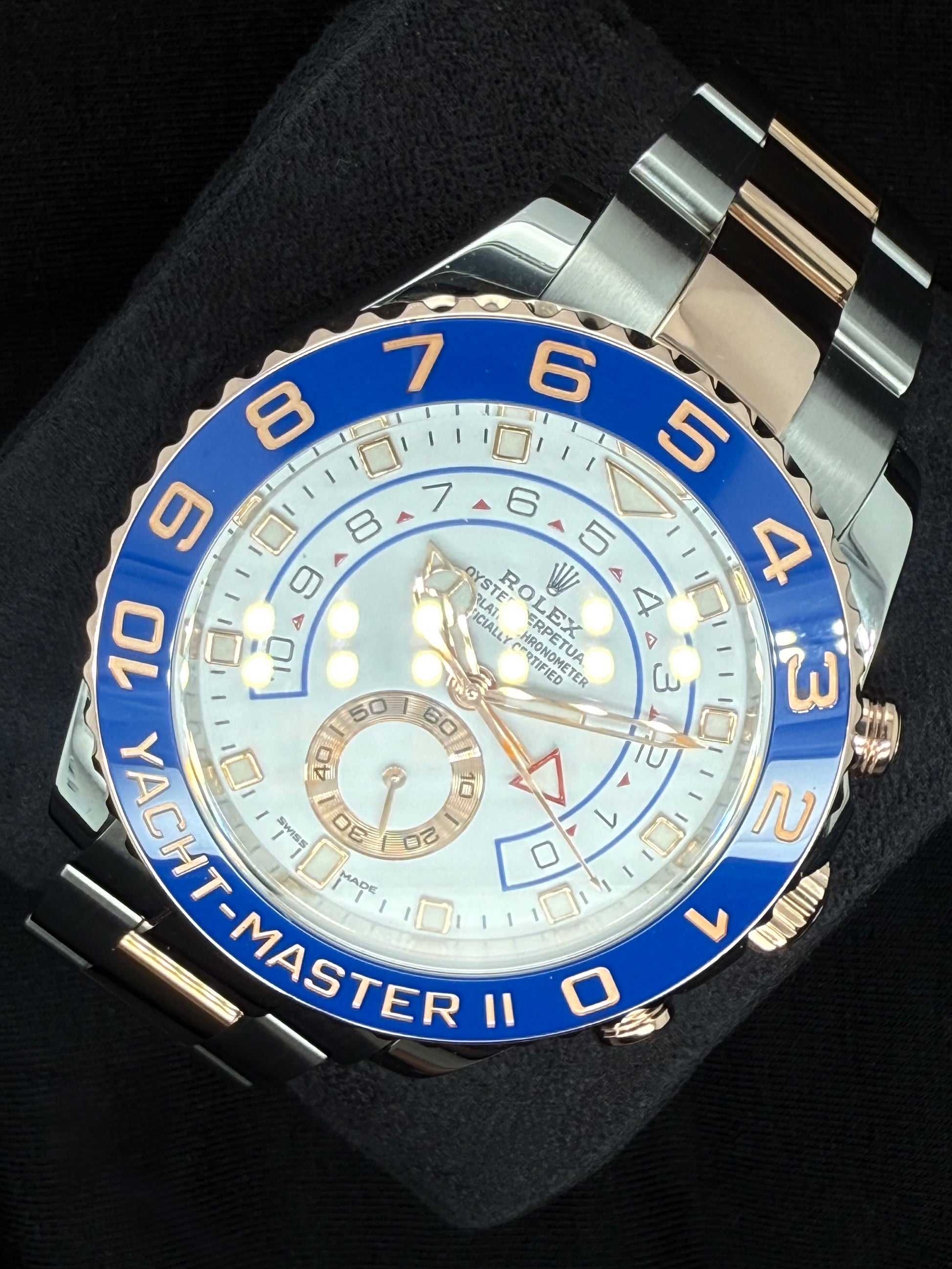 The Yacht-Master features a range of striking dial options, including sunburst blue and matte black, with Chromalight luminescent markers ensuring optimal readability in all conditions.
